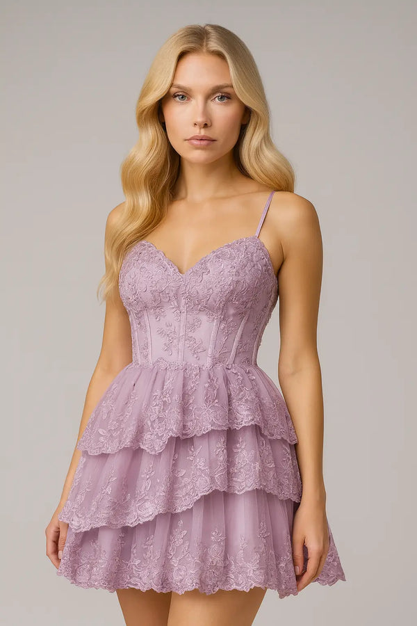Step into the spotlight with this Sparkly Spaghetti Straps Homecoming Dress, designed especially for teens who want to shine at their special event. Featuring delicate lace appliques layered over sparkling tulle, this tiered A-line mini dress combines youthful charm with elegant glamour. The spaghetti straps add a delicate, feminine touch while providing the perfect balance of support and style for all-night comfort.