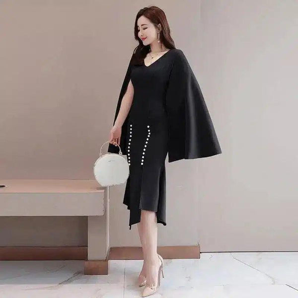 Vestido com capa elegante para mulher, com aplicações de pérolas