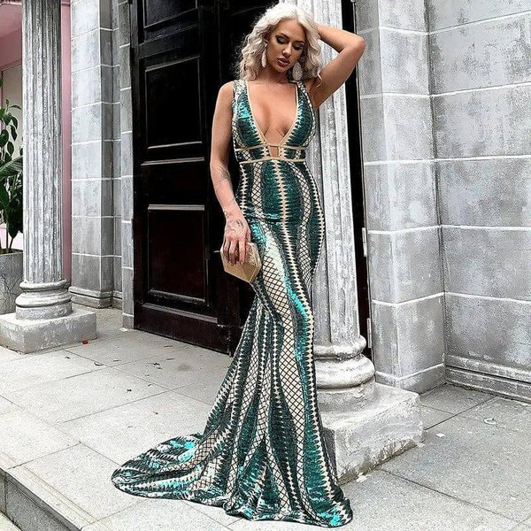 Vestido de noite às riscas irregulares com cauda comprida e suspensório