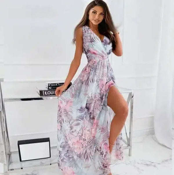 Vestido de verão em chiffon estampado com renda e sem mangas para mulher