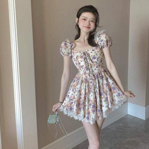 Vestido de manga curta de renda com folho francês para mulher