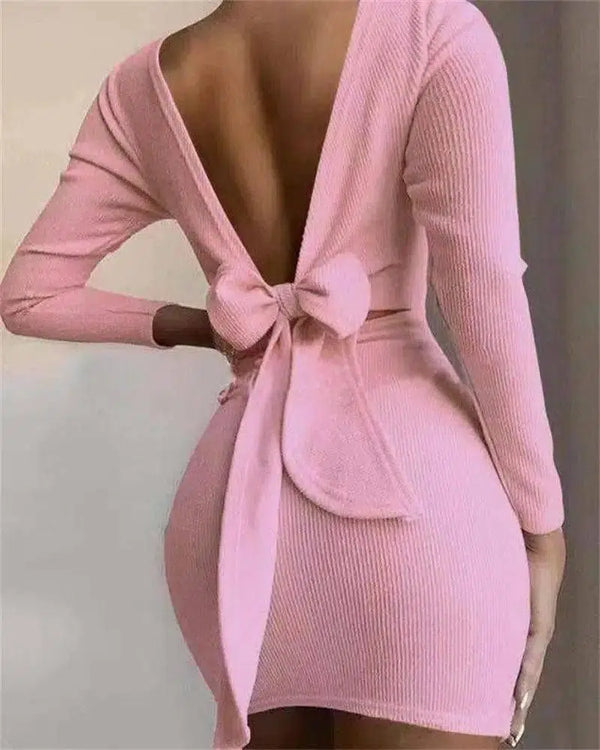 - Decote: Costas em V profundo com pormenor de laço