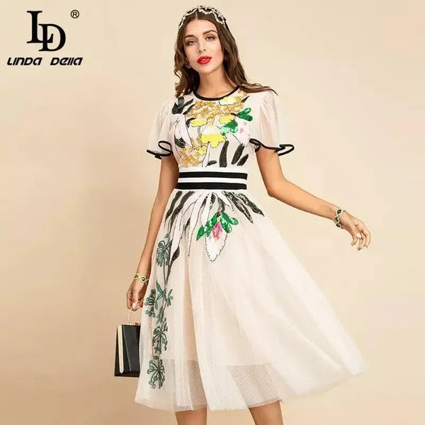 LD LINDA DELLA Novo 2021 Mulheres verão Moda Passarela Midi Vestido Manga Borboleta Bordado com Lantejoulas Senhoras Slim A-Line Vestidos