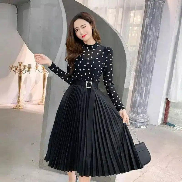 Vestido midi plissado às bolinhas com cinto